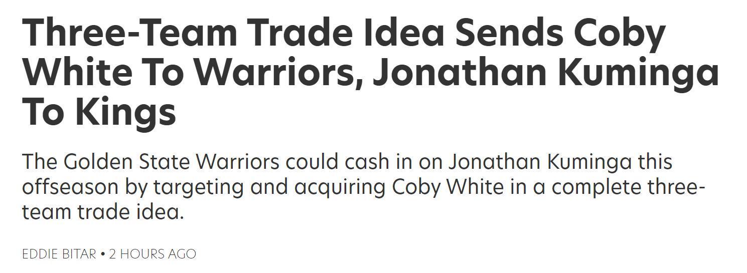 各取所需!在库明加与勇士队陷入离队闹剧,国王队虎视眈眈的情况下,美媒《fadeawayworld》晒出3队5人交易方案,通过交易国王如愿得库明加,勇士则一口气迎来两大新援。